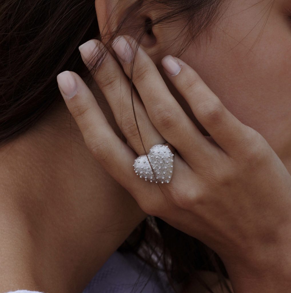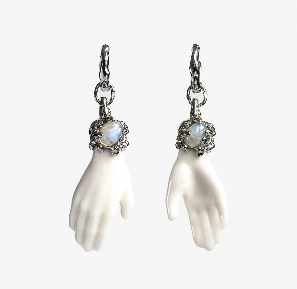 Визитная карточка бренда московских художников Саши Ольховского и Ани Павловой – массивные кольца с необработанными камнями, словно они вот-вот подоспели в месторождении. Вдобавок аутентичные украшения создаются из серебра, фарфора и жемчуга. Динамичные природные формы или, напротив, конкретные мотивы с ладошками – здесь каждый найдет вариант по душе.