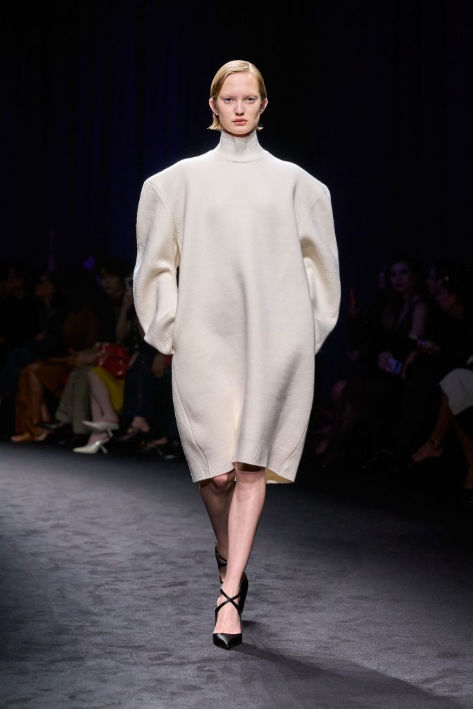 Если в прошлом сезоне дизайнеры активно экспериментировали с декольте, то в осенне-зимнем сезоне 2026 маятник качнулся в противоположную сторону. Один из самых заметных подиумных приемов – высокий ворот. Он появляется в самых разных интерпретациях: от плотных водолазок и объемных свитеров до платьев и жакетов с закрытой линией шеи. Такой прием делает образ более графичным и собранным. Особенно выразительно тренд смотрится в коллекции Carven. Дизайнеры делают ставку на архитектурные силуэты и подчеркнуто высокие воротники, которые формируют почти скульптурную линию плеч и шеи. В итоге даже минималистичные вещи выглядят эффектно и очень современно.