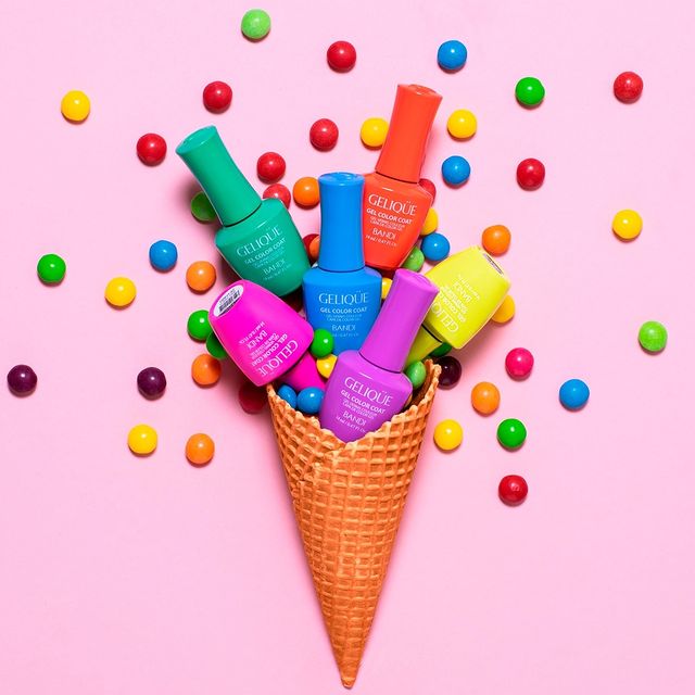 Просто представь, что твой мастер побывала на радуге в рекламе «Скитллс» и вернулась оттуда, полная вдохновения — попроси создать тебе самый «конфетный» маникюр из всех имеющихся ярких оттенков. Немного «кислотные», они смотрятся круто и по отдельности, и вместе.
