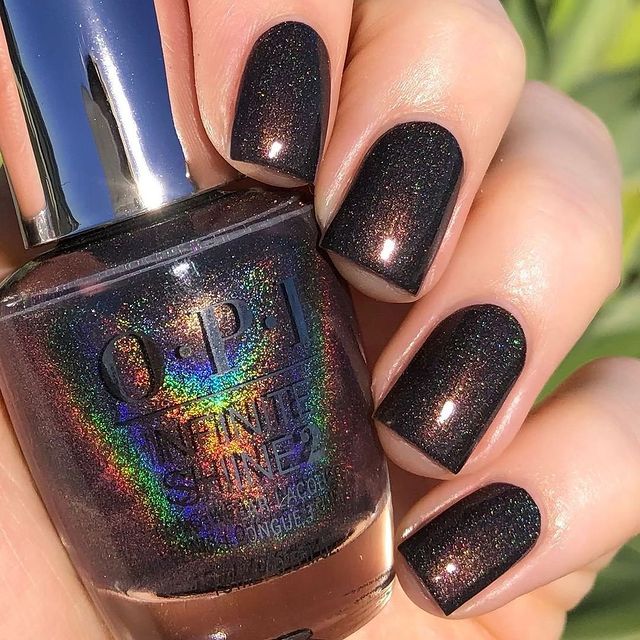 Не только светлый или неоновый здорово смотрится на загорелой коже. Если ты выберешь темный оттенок, «обогащенный» сложными блестками, то не сможешь оторвать взгляда от своего нового маникюра вплоть до самой коррекции.