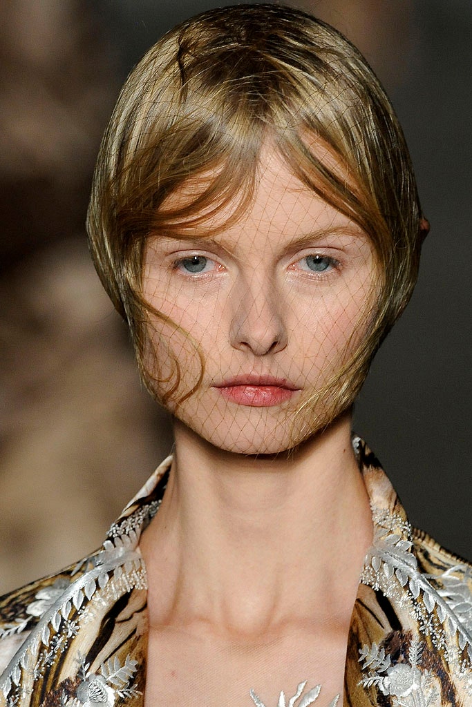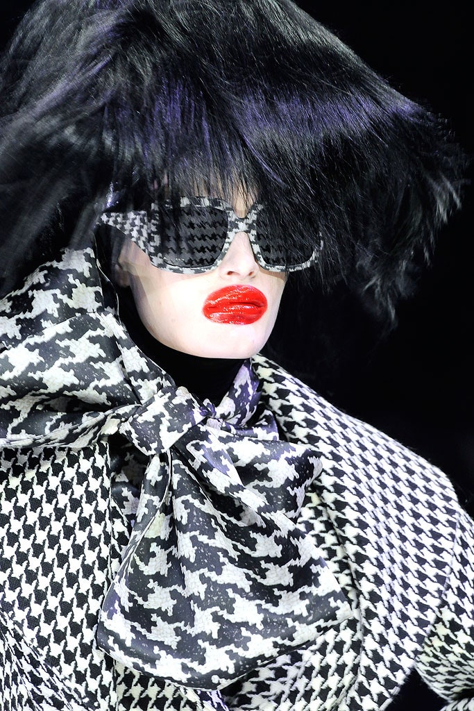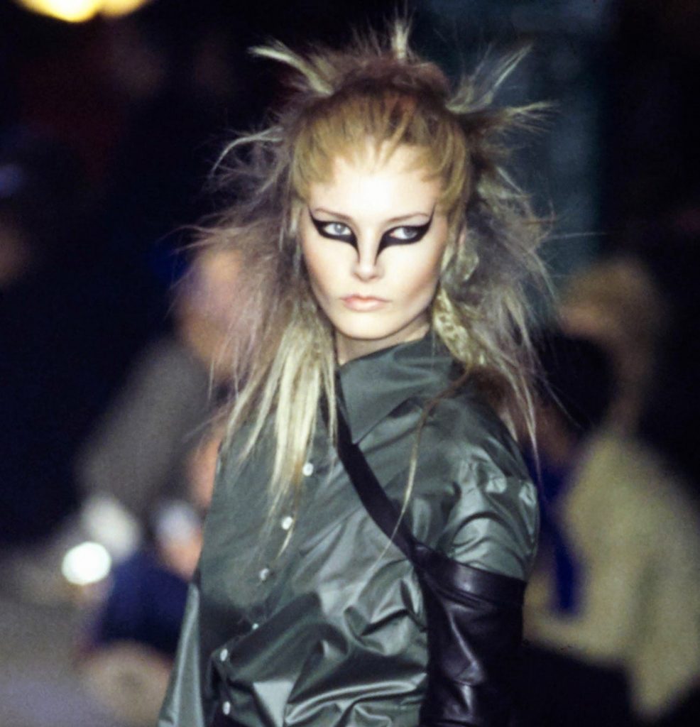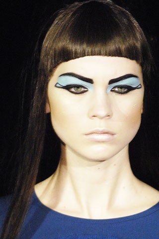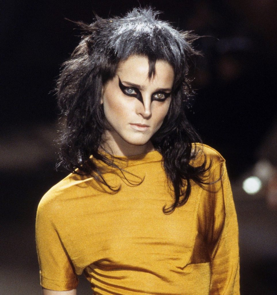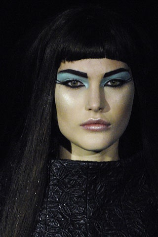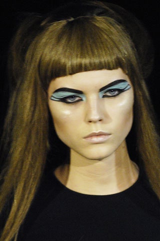Черные графичные стрелки с опущенным внутренним и задранным верхним уголками, прически-гривы и кожаные элементы одежды. Все это про показ по мотивам романа Герберта Уэллса «Остров доктора Моро» про остров, населенный животными получеловеческого вида. Над макияжем работал визажист Тополино, известный своим гримом для Майкла Джексона.