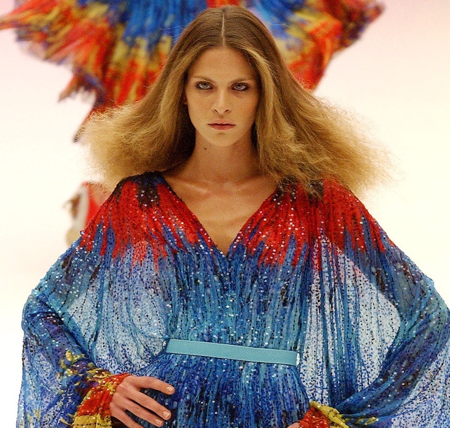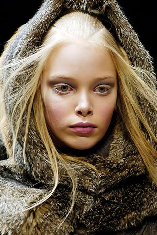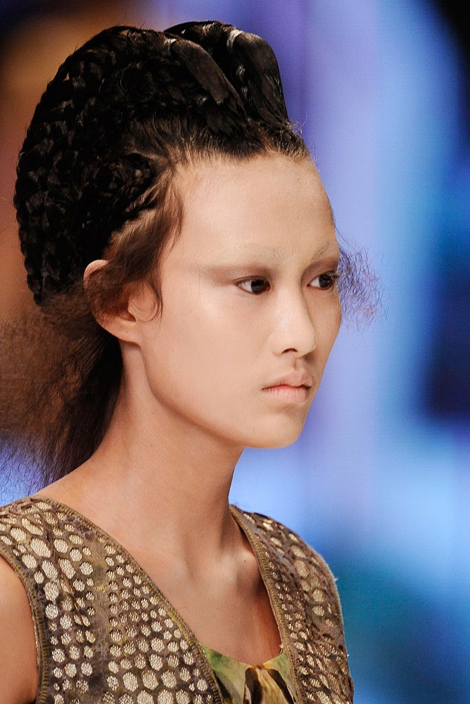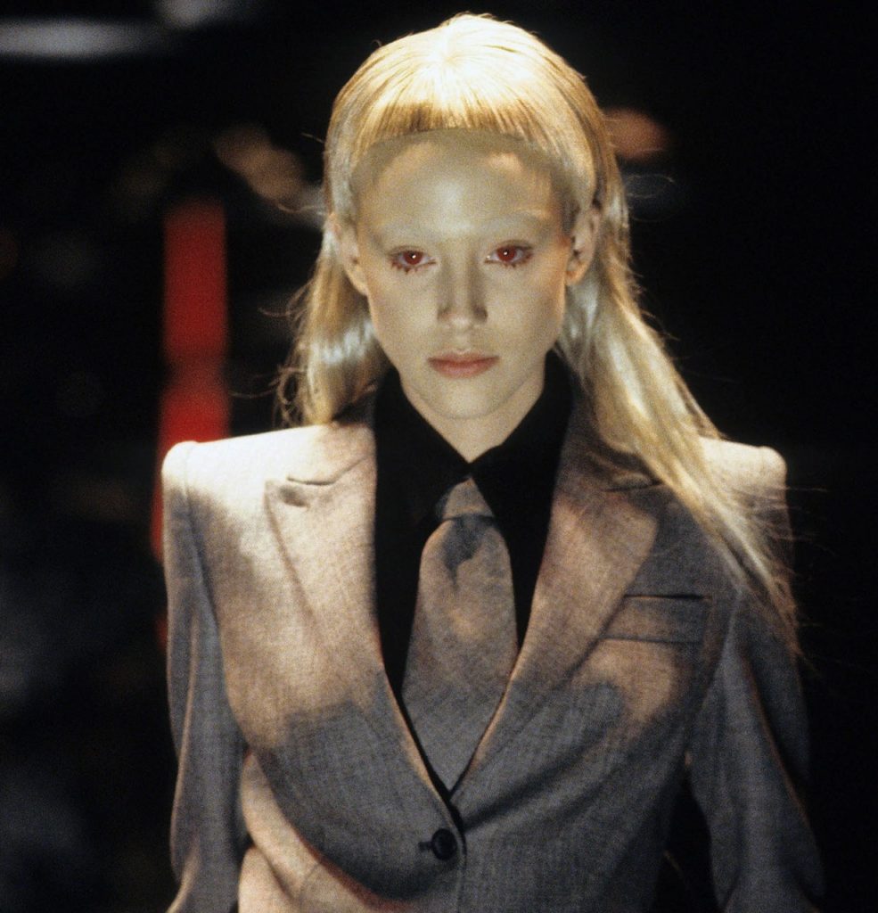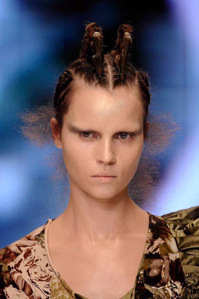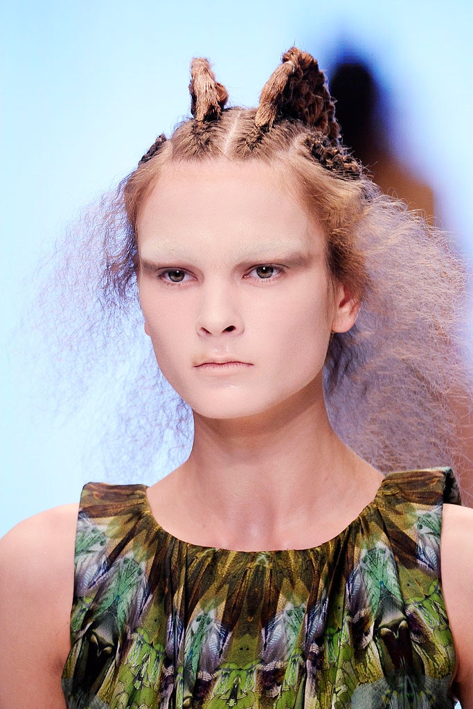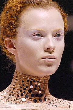 Последнее прижизненное шоу Маккуина, на котором макияж больше похож на грим. Задача визажистов заключалась в том, чтобы превратить моделей в подводных существ. Рельеф лица они меняли с помощью накладок — убрали брови, сделали выпуклыми скулы и виски. Про волосы тоже не забыли — прически были в форме плавников.