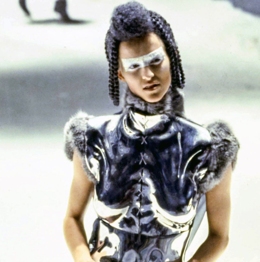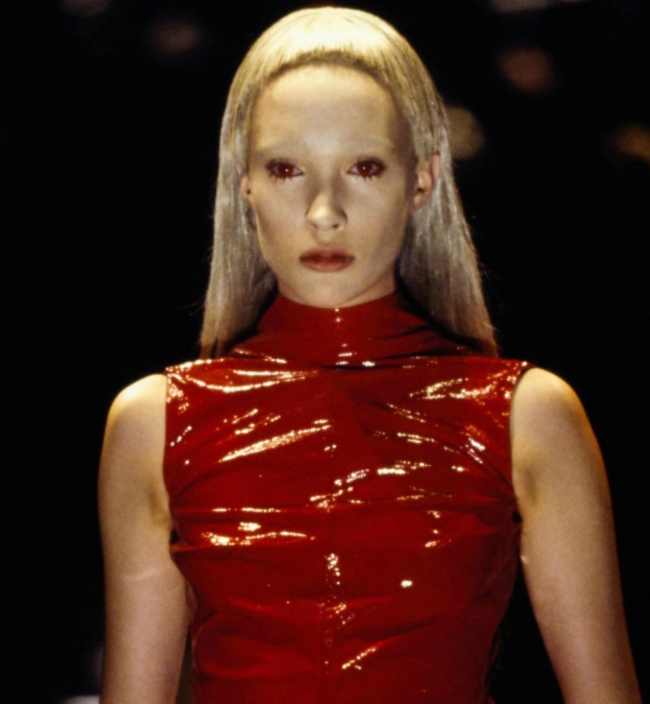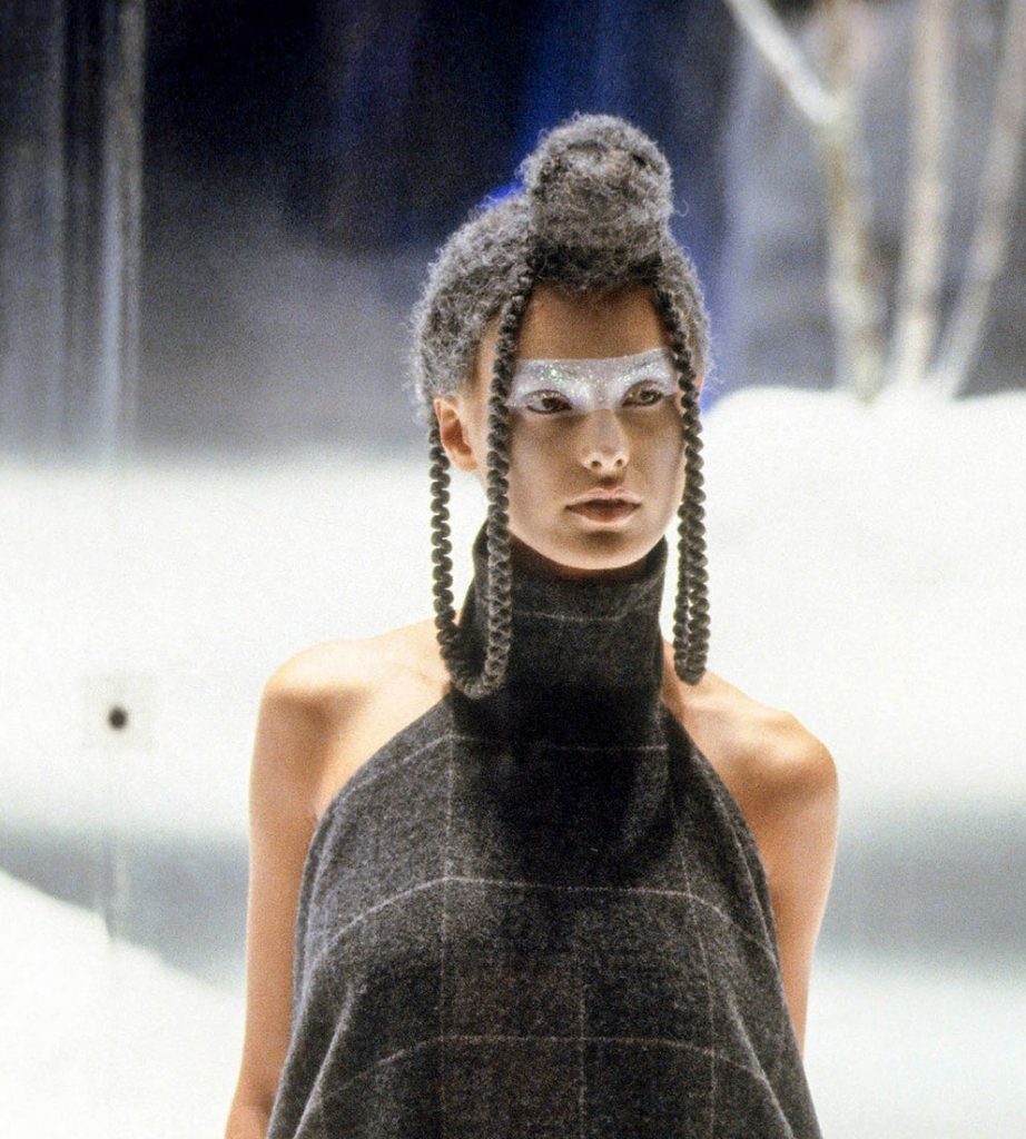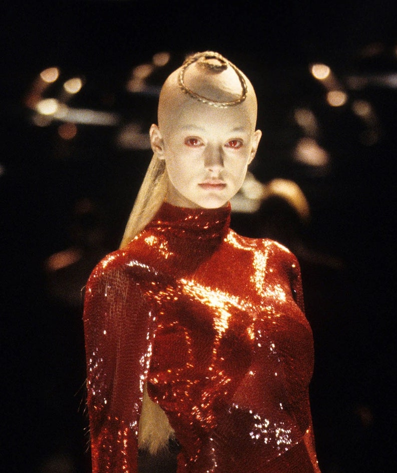 Макияж, в котором позже Маккуин появился на обложке The Face. Красные линзы, бледное матовое лицо, мини-косы полукругом или полное их отсутствие — инопланетный образ готов. А закрывала шоу модель в кольце пламени.