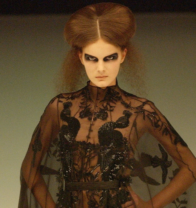 Маккуин долго исследовал религию и связь между древним Египтом и народной культурой первых британских иммигрантов (откуда он сам родом). Так на показе соединились прически и графичный макияж Нефертити и одежда от кутюр.