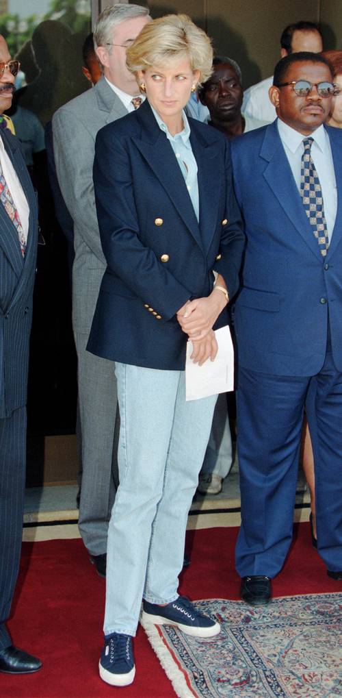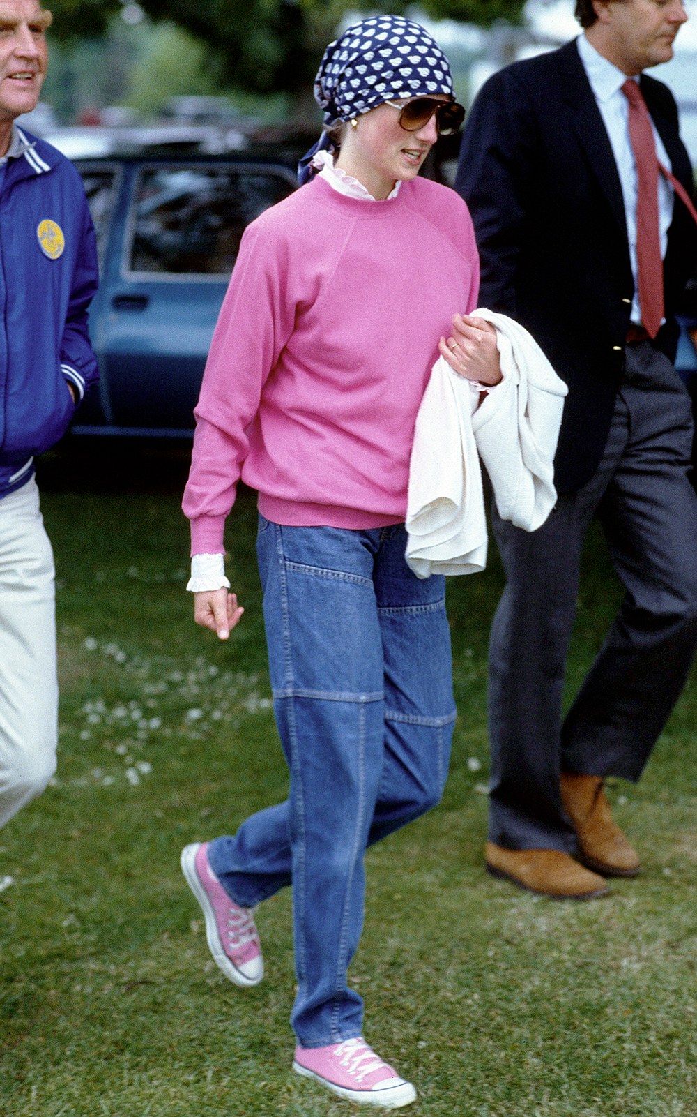 С кроссовками/кедами в тон пиджаку. Леди Ди, например, обожала легендарные Superga