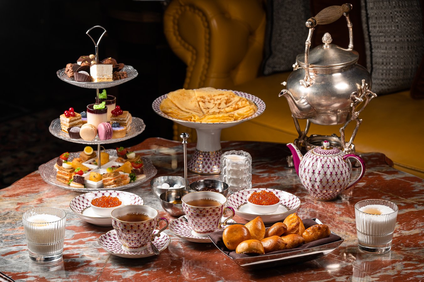 У тебя появится возможность побывать на чайной церемонии, конечно же, с блинами и выпечкой: фирменными пирожками и ватрушками, а также конфетами ручной работы, натуральным мармеладом и многим другим. Кстати, чай готовят в старинном серебряном чайнике. Ну и какая же Масленица без специального сета с классическими, дрожжевыми блинами и гречишными оладьями. Подаются они с красной, щучьей икрой, перепелиным яйцом, сметаной, вареньем, медом и сгущенкой.