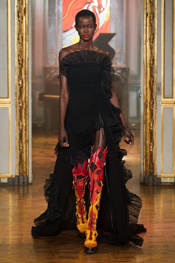 Вместе с этим в коллекциях SS 22 почти не остается места классике. На смену приходят яркая палитра, перья, кроп-топы в форме бабочек, пайетки и платья в насыщенных оттенках с бахромой.
