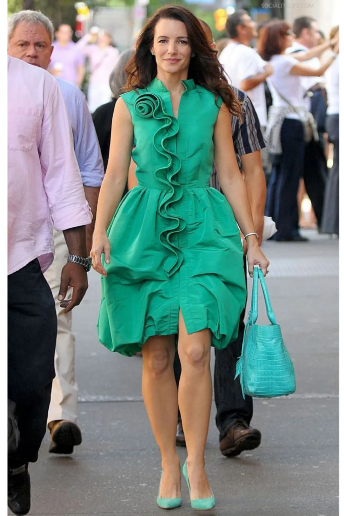 Саманта Джонс всегда знала, как привлечь внимание противоположного пола. И дело не только в уверенности в себе и отменном умении флиртовать, но и в чувстве стиля. Героиня Ким Кэттролл носила брючные костюмы на голое тело, роковые красные платья, а еще обожала анималистичный принт. Среди наших любимых образов Саманты – ансамбль, состоящий из белоснежного костюма, алой футболки и объемных золотых сережек. Мы подготовили свой вариант этого аутфита и предлагаем заменить футболку на корсетный топ, а бежевые туфли – на зеленые слингбэки.
