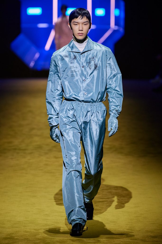 В коллекции Prada FW 22/23 мы нашли немало отсылок к космосу. Среди них и нейлоновые комбинезоны, которые были представлены сразу в нескольких оттенках (нам больше всего запомнился небесно-голубой). Делаем ставку, что в новом сезоне он станет новоц it-вещью модного Дома, и мы увидим его на героях стритстайла и инфлюенсерах.
