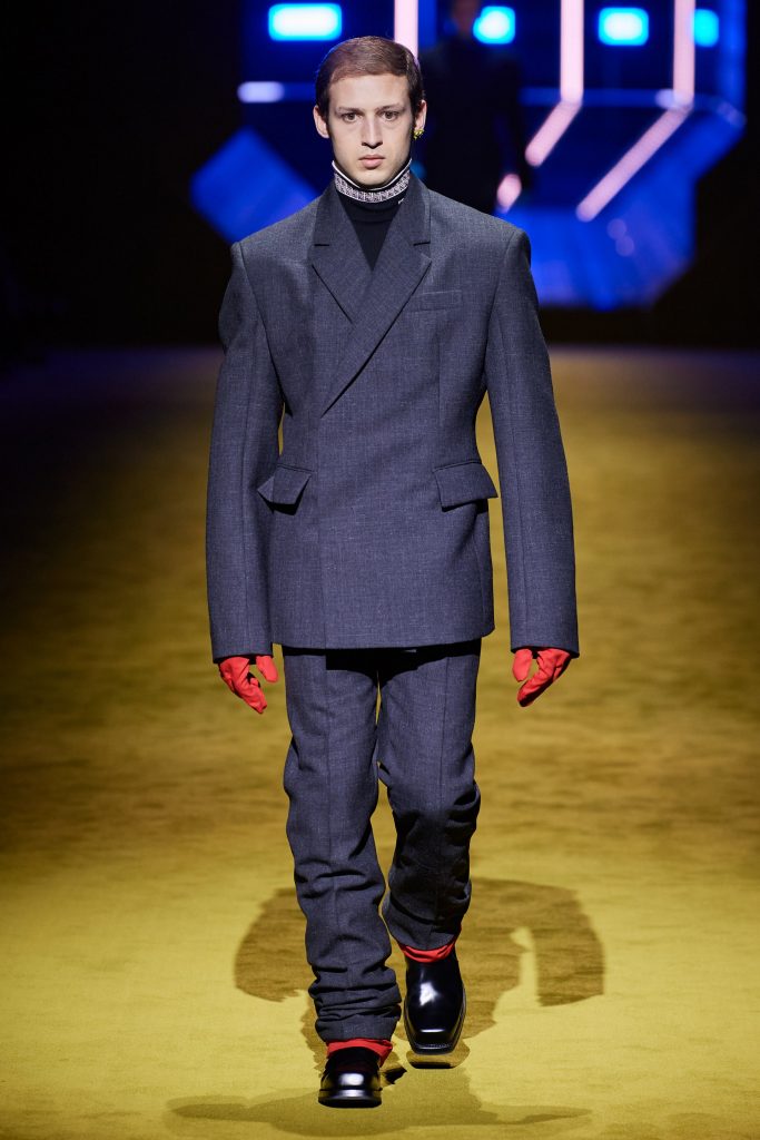 На показе Prada мы увидели не только отсылки к космосу, но и интересные цветовые сочетания. Так, в новом сезоне Миучча и Раф предлагают нам носить серые брючные костюмы с красными аксессуарами. И нам этот тренд определенно нравится.