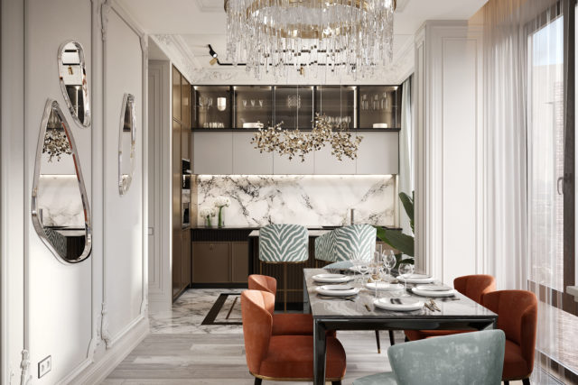 «Речь не только о сдержанных элементах, но и о «нарядных» барельефах, фризах и карнизах. Такой сложный микс классического гипсового оформления стен в сочетании с современной мебелью и освещением придает интерьеру неповторимый стиль».