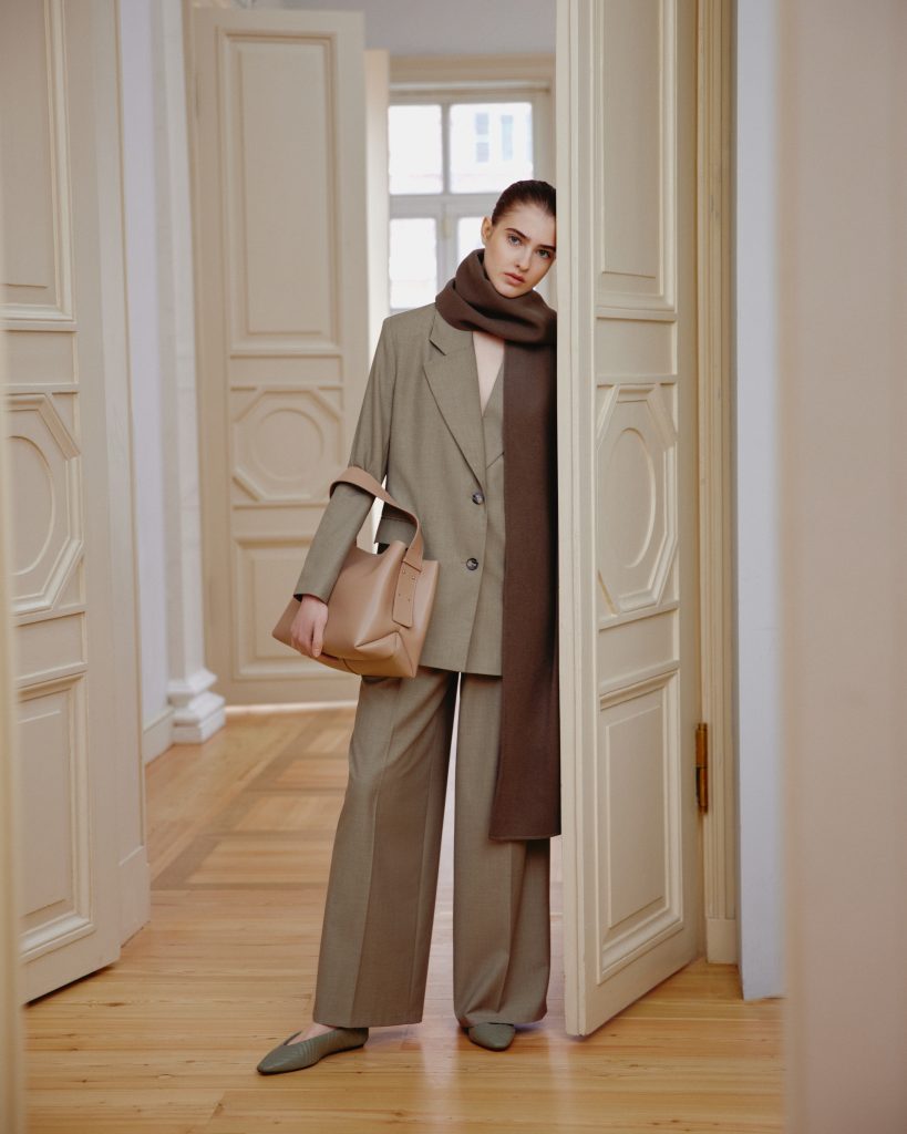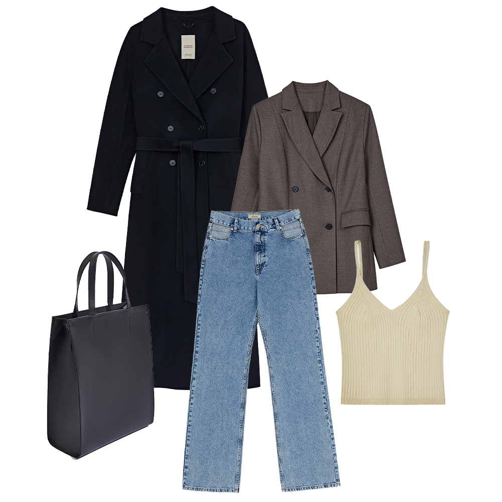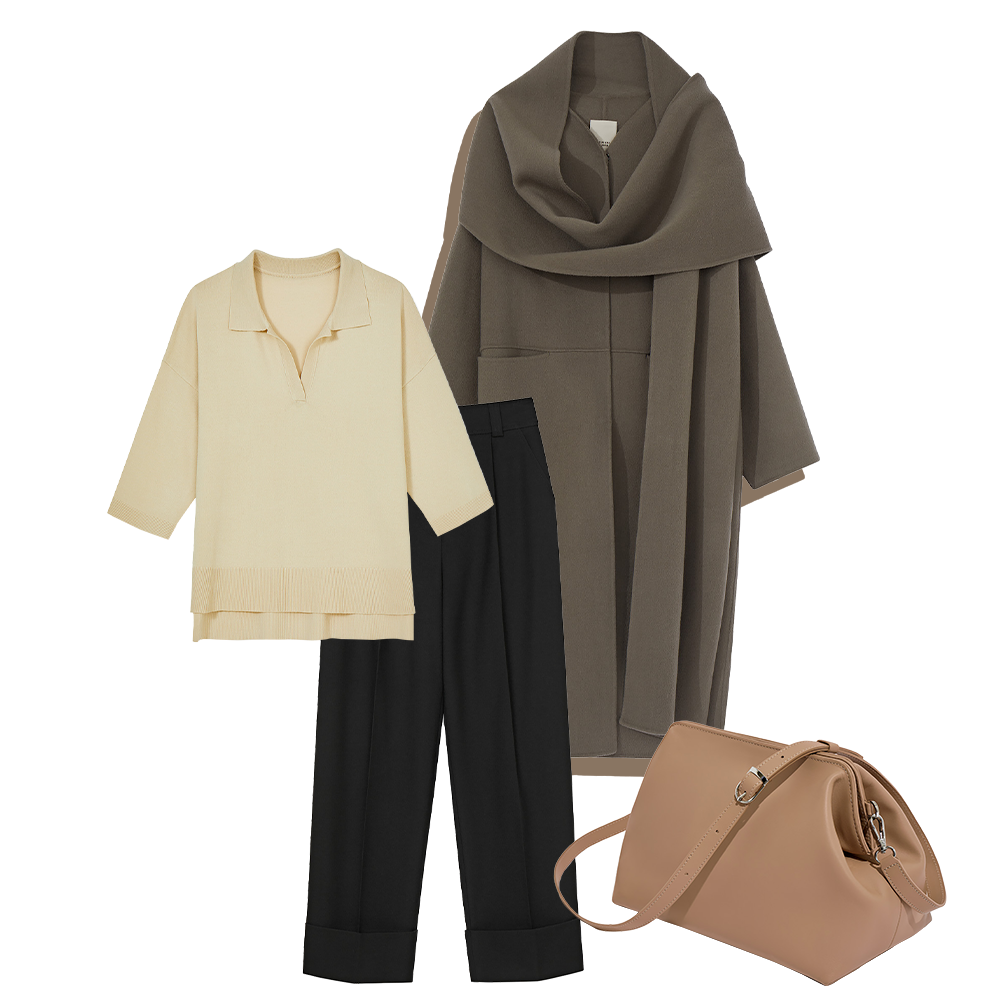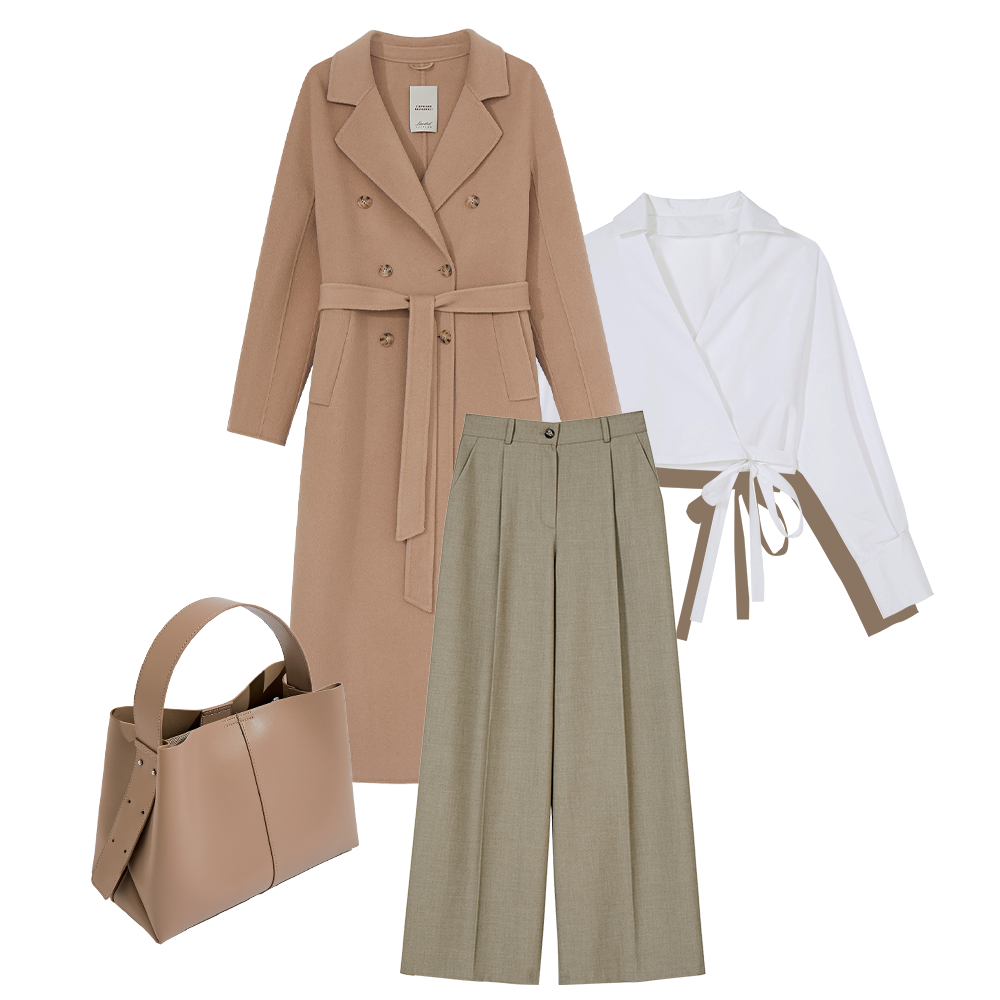 Сейчас деловой дресс-код претерпел значительные изменения. Наш идеальных вариант для бизнес-встреч – бежевое двубортное пальто, укороченная белая рубашка, широкие брюки и вместительная сумка-тоут.