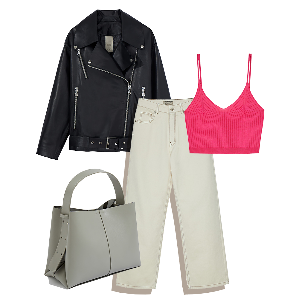 В теплую погоду без акцентных вещей не обойдись. Мы советуем отдать предпочтение насыщенно-розовому трикотажному кроп-топу с фактурным плетением и классическим белым джинсам. В качестве верхней одежды можно выбрать объемную косуху (это, кстати, вневременная классика).
