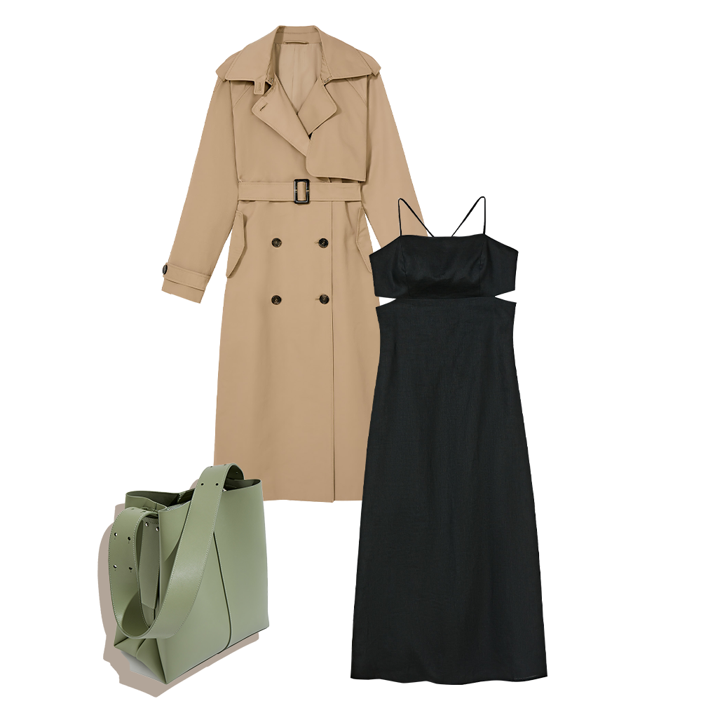 На свидание предлагаем тебе отправиться в классическом бежевом тренче и черном платье с открытой спиной и шнуровкой (которое просто создано для романтичного настроения). Дополнить образ можно сумкой-тоутом мятного цвета. Такое сочетание получится не слишком откровенным, но и не скучным. Идеальный вариант, чтобы произвести впечатление.