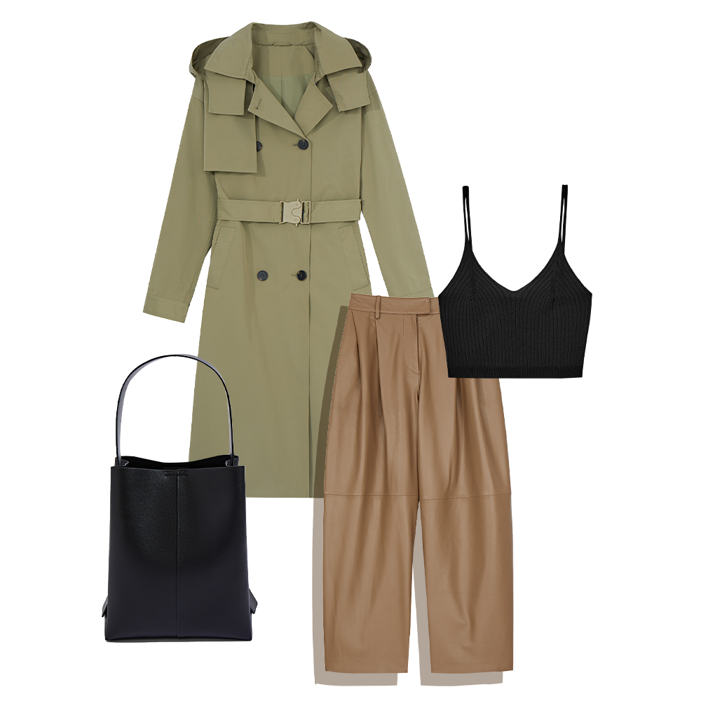 Вещи из новой коллекции «Снежной Королевы» идеально впишутся и в повседневную жизнь. Если ты давно мечтала о базовых кожаных брюках, точно найдешь подходящий вариант. Для этой подборки мы выбрали бежевые, но в линейке есть и черные. Образ можно дополнить трикотажным кроп-топом и зеленым тренчем. И самое крутое, что все эти вещи можно сочетать практически с чем угодно, потому что это классическая база.