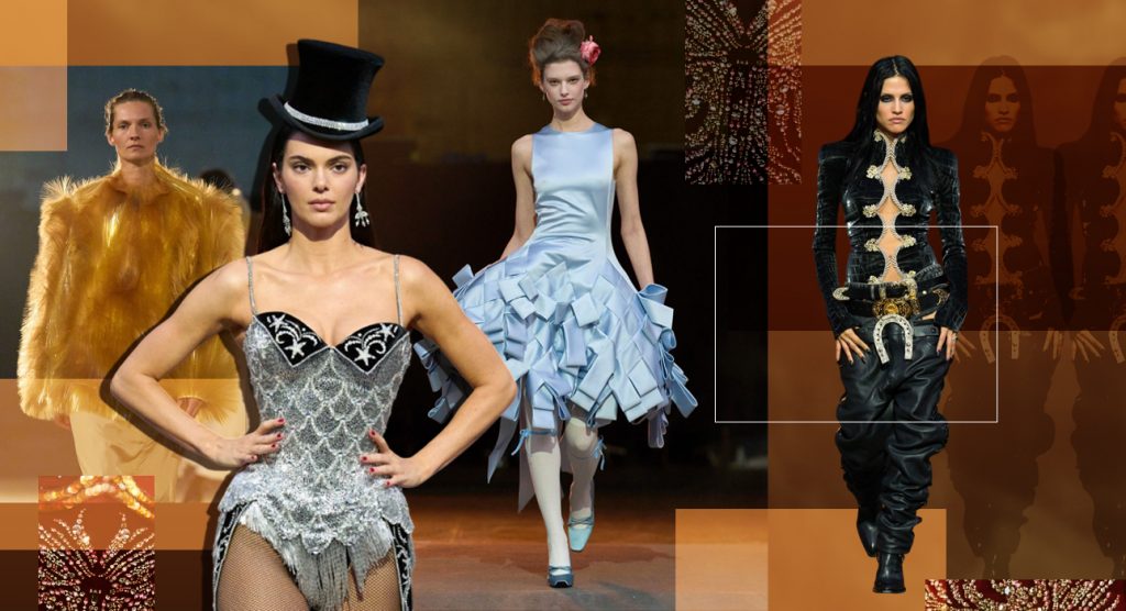 Сразу после выступления Николь на импровизированный подиум вышла Кендалл Дженнер, открыв первую часть шоу – Голливудский гламур или эпоху шоугерлз. Модель предстала в образе главной героини фильма «Мулен Руж!» 2001 года: черный цилиндр, блестки и стразы, сетчатые колготки и, конечно, серьги Tiffany&Co. Следом на подиуме появилась светская львица Оливия Палермо в платье Gucci La Mecenate, созданном новым креативным директором бренда Демной Гвасалией. Кстати, точно в таком же наряде была и Деми Мур на премьере фильма The Tiger во время Миланской Недели моды. За Кендалл и Оливией на подиум вышла российская модель Майя Вождаева в образе из «Великого Гэтсби» – в платье, созданном художницей по костюмам фильма Кэтрин Мартин в сотрудничестве с Miu Miu.