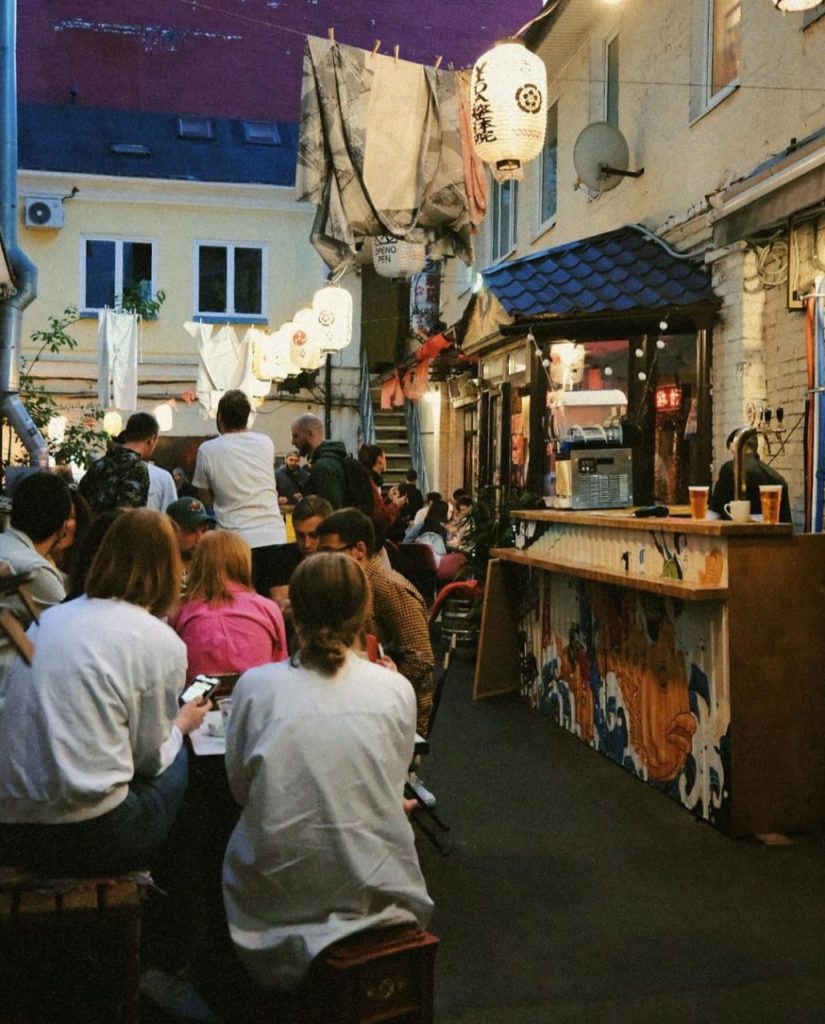Отличное место, чтобы провести вечер уикенда в японском стиле. Тон атмосфере задают узкая улочка, заставленная столами, сделанными из желтых бочек, фонари из рисовой бумаги, вывески с иероглифами и снующий туда-сюда народ. Японская еда, японские же крафтовый эль и лагер и хокку-коктейли на основе саке прилагаются.