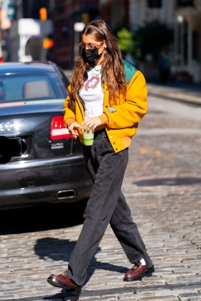 Мы уже давно заметили, что бомберы — любимая верхняя одежда Хадид. Она носит их с винтажными футболками, широкими джинсами, опасными мини, лоферами и кожаными бермудами. В общем, советуем вдохновиться выходами Беллы и выбрать пару бомберов на осень.