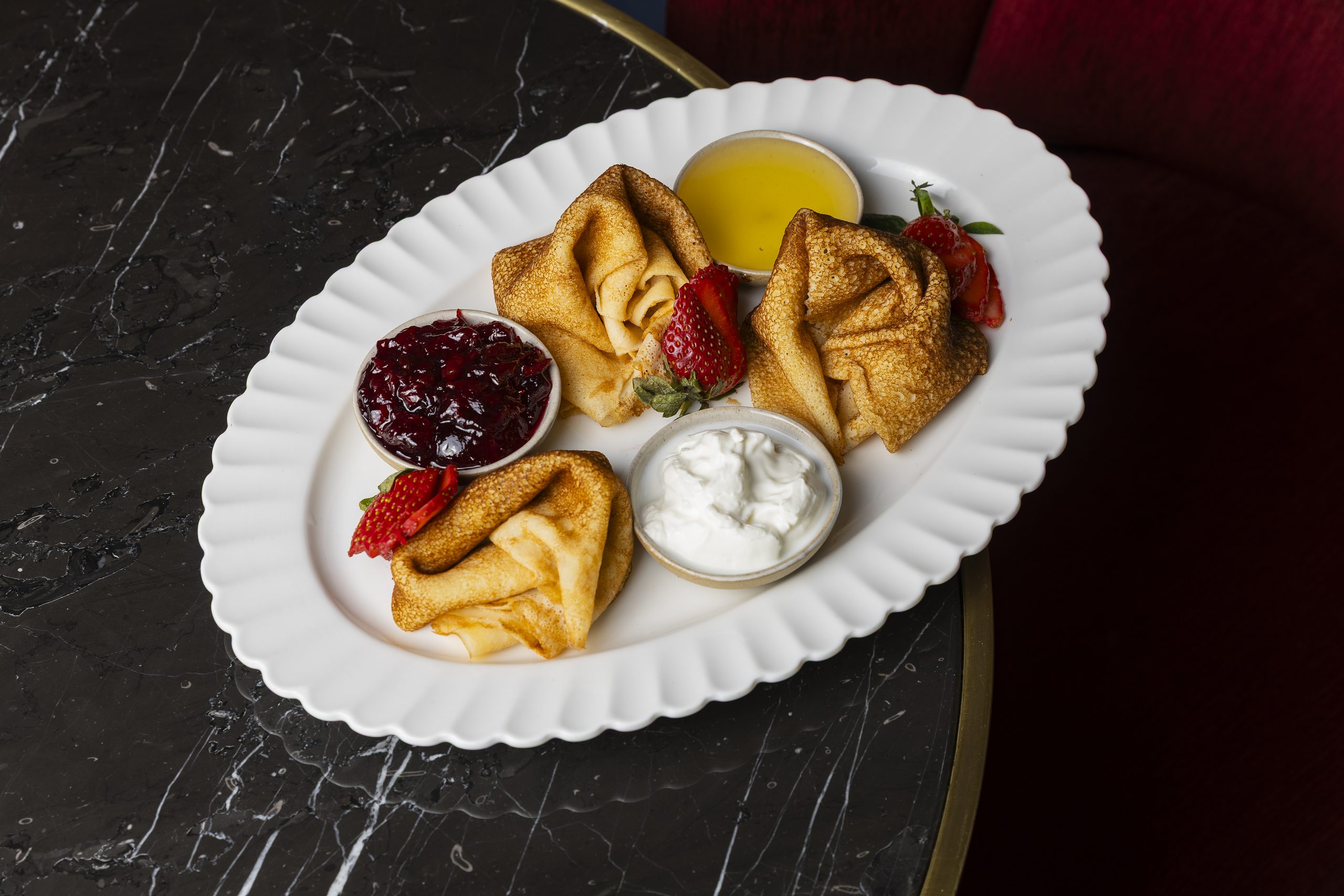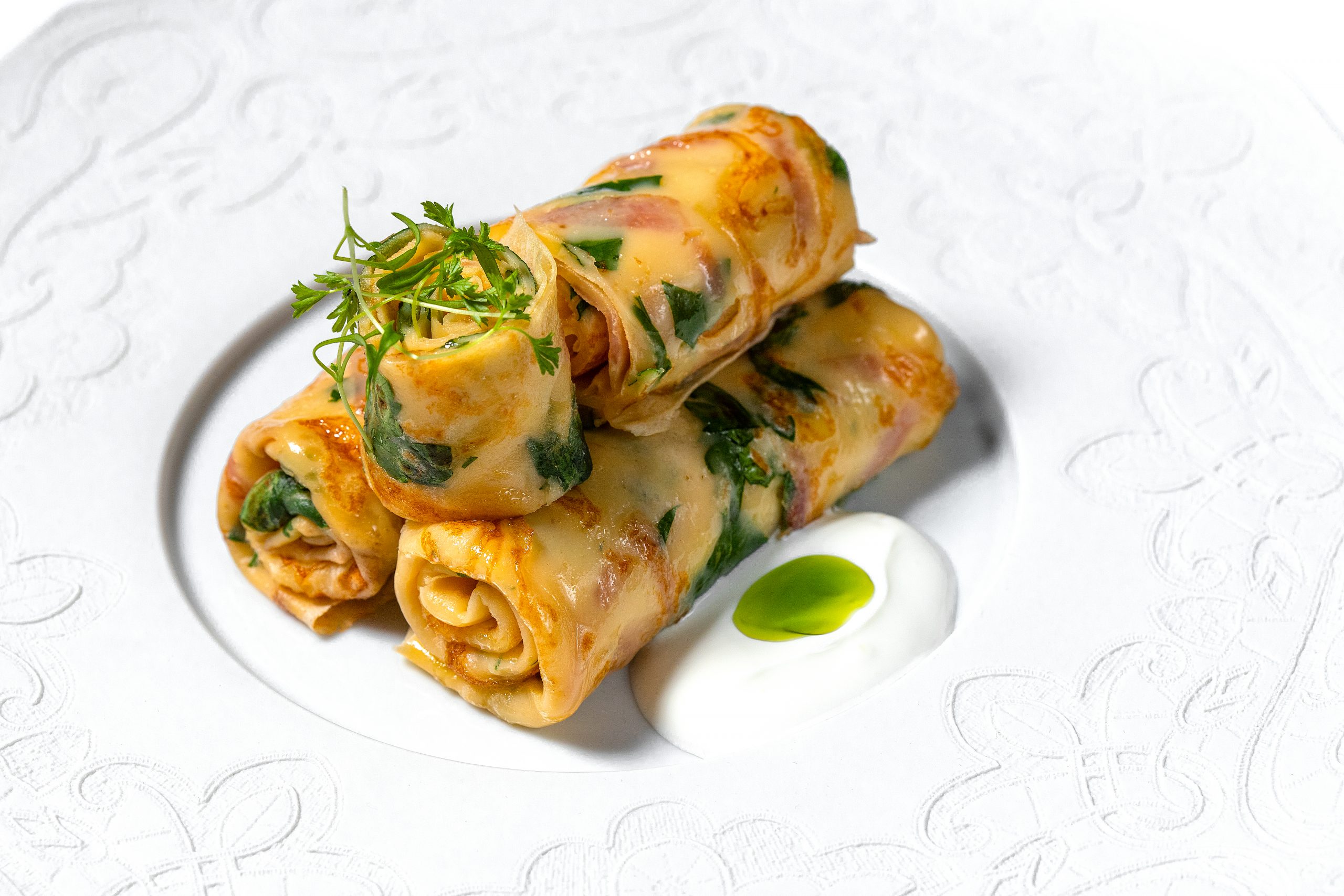 В специальном масленичном меню, разработанном шеф-поваром Алексеем Складчиковым, представлены гречишные оладьи и пшеничные блины, а также пончики с икрой кижуча и осетра. За сладкие позиции отвечал шеф-кондитер Артем Грачев. Он подготовил французские crêpes Suzette с апельсиновой карамелью и ванильным мороженым.