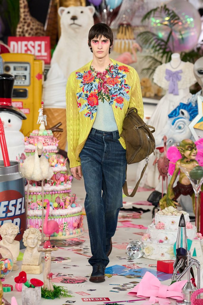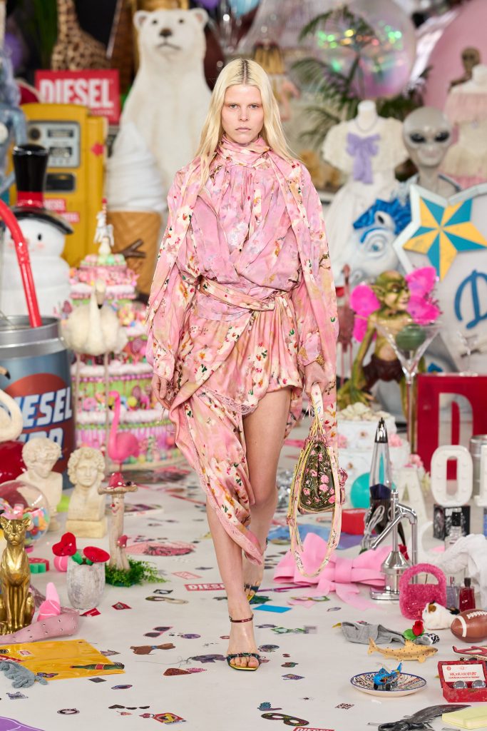 Diesel под руководством Гленна Мартенса снова модный и желанный – и дело отнюдь не только в сет-дизайне, хотя о нем тоже стоит поговорить. Теперь в Diesel ты не выглядишь так, будто только что выбралась из канавы. Скорее ты отдаешь дань уважения прекратившему свою работу Y/Project, дух которого отчетливо чувствуется в новой коллекции. Что касается сет-дизайна, то здесь все в айдентике бренда – он по-настоящему сумасшедший. Куски пиццы, торты, резиновые животные, игровые автоматы и секс-игрушки – Гленн Мартенс собрал на подиуме буквально все.