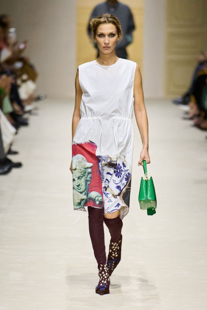 Показ Prada прошел в духе предыдущих сезонов, и коллекция приятно впечатлила деталями. Особенно запомнились туфли и носки в цветочек, которые уже смело можно назвать одним из главных трендов на эту весну. Кроме того, все 60 луков представляли всего 15 моделей, и даже Белла Хадид выходила на подиум четыре раза. Как они успевали переодеваться? Никак – модели просто снимали один слой образа за другим, наглядно демонстрируя суть и силу лэйеринга (многослойности).