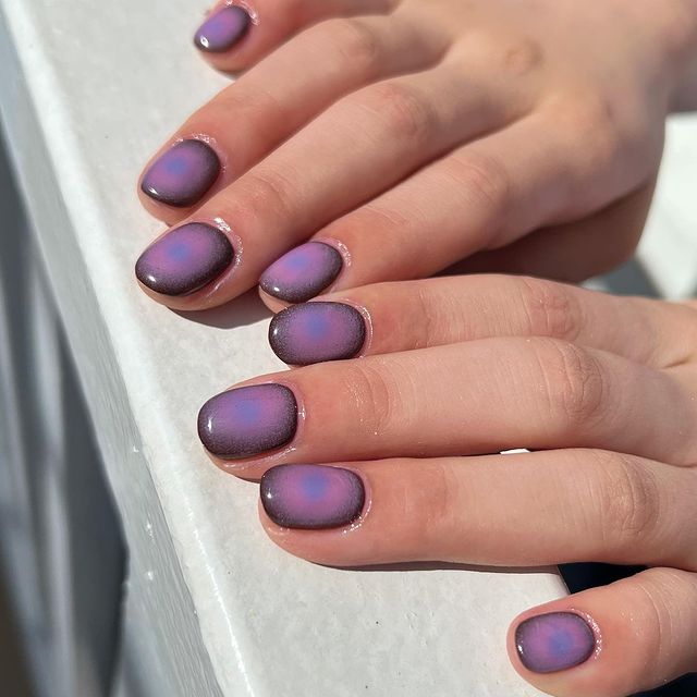 Техника «рисования воздухом» позволяет добиться мягкого перехода между цветами, поэтому ее часто используют для создания градиента и маникюра по ауре.