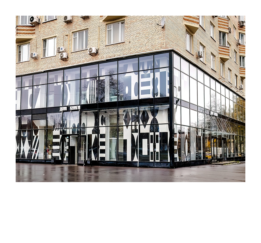 В данном проекте Андрей Люблинский идет путем формы, создавая абстрактную черно-белую ритмичную композицию, отталкиваясь, в первую очередь, от контекста места. Он пытается найти визуальные рифмы как с окружающими архитектурными объектами, так и с самим фасадом книжного магазина. Монохромные вытянутые геометрические изображения, взаимодействуя с черными рамами витрины, придают динамику, одновременно привлекая внимание к магазину.
