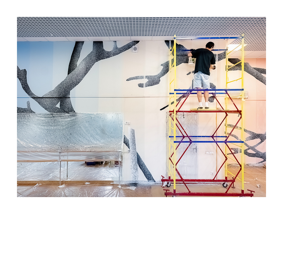 В эскизе ландшафт встраивается в интерьер: стволы деревьев – внешняя уличная среда – проникают в пространство учреждения. Динамика веток воплощает движение и рост, а яркие цвета становятся символом творческих проявлений, что соотносится с концепцией многофункциональных залов культурного центра. Сама площадка – зеркальный зал – тоже выбрана не случайно. Кирилл Ашастин часто работает с зеркалами, и здесь мотив отражений вновь вторит идее диалога природы и пространства, созданного человеком.