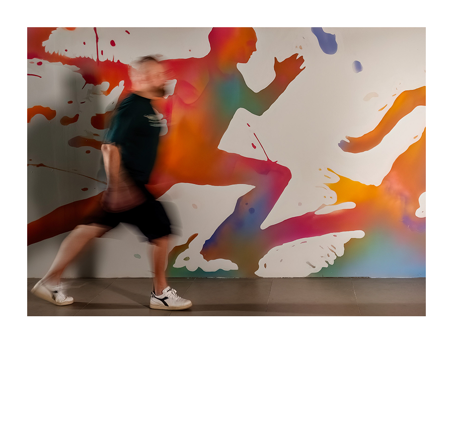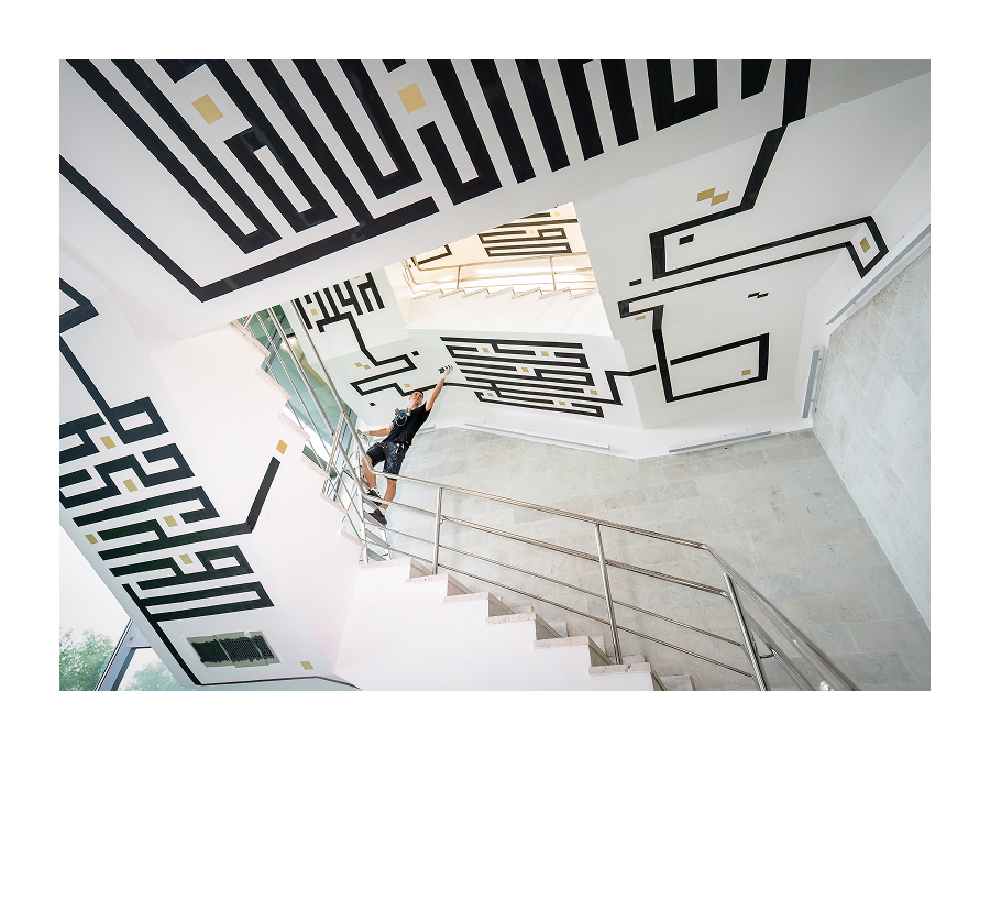 Эта работа – визуальная аллегория человеческой деятельности, познания и творчества, где каждая буква и слово становятся частью пути к пониманию культурных понятий и смыслов. Шрифтовая композиция, отсылающая к культурному наследию, но интерпретированная в современном стиле, подчеркивает связь времен. Она построена в форме извилистого лабиринта, которому вторит архитектура Культурного центра «Москвич» – изгибы лестниц и формы комнат и коридоров. Так, передвижение превращается в путь в поисках смыслов. В нем текст и пространство создают единую среду осмысления культуры и вовлекают зрителя в живой опыт исследования.