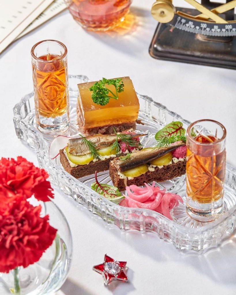 За меню бара отвечает молодой и талантливый шеф-повар Ян Бычихин, он показал свою интерпретацию хитов русской и советской кухни – яйца перепелки, фаршированные щучьей икрой, холодец из говядины со свиными копытцами, гречетто с белыми грибами и ракушки «по-флотски», а еще бутер со шпротами и киви. Еще интереснее тут барная карта, потому что в ней сплошь локальные продукты – российский джин, виски, домашние настойки из подмосковного киви и даже ратафией из липы.