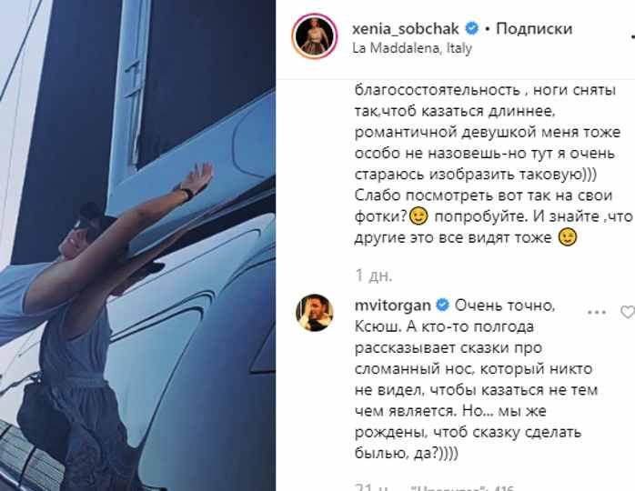 А теперь решил ответь и Виторган! И сделал он это под постом бывшей жены в Instagram. Ксения написала: «Я как-то придумала потрясающий. на мой взгляд, проект. Разбор инстаграма светских персонажей с психологом. Все, конечно, брать не стали (светский свет у нас ваще не самоироничен), но мои подозрения были подтверждены — большинство «светских» знакомых, если их инста связан не с работой а с досугом, выставляют то, чем хотят похвастаться, но на самом деле то, чего у них нет. И если с этой точки зрения рассматривать «веселые картинки», то вот сразу видно- кто просит прокомментировать свои ноги, и значит, сильно озабочен своей фигурой), кто-то хочет показаться умным, и пишет изьебистый список прочитанных книг, кто-то недоволен личной жизнью, кто-то боится старости. За каждым фото -месседж. Но совсем не тот, который на фото. Смотрите ЗА фото. Взять хотя бы этот видео. Его бы еще и надписать : «Парус. Яхта. В этом мире только мы одни». На самом деле я давно уже не на яхте а пашу. Яхта не моя-то есть Бобик в гостях у Барбоса демонстрирует благосостоятельность, ноги сняты так, чтоб казаться длиннее, романтичной девушкой меня тоже особо не назовешь- но тут я очень стараюсь изобразить таковую))) Слабо посмотреть вот так на свои фотки? Попробуйте. И знайте, что другие это все видят тоже» (Орфография и пунктуация автора прим. ред.).