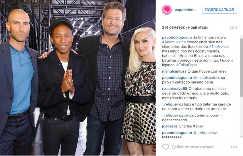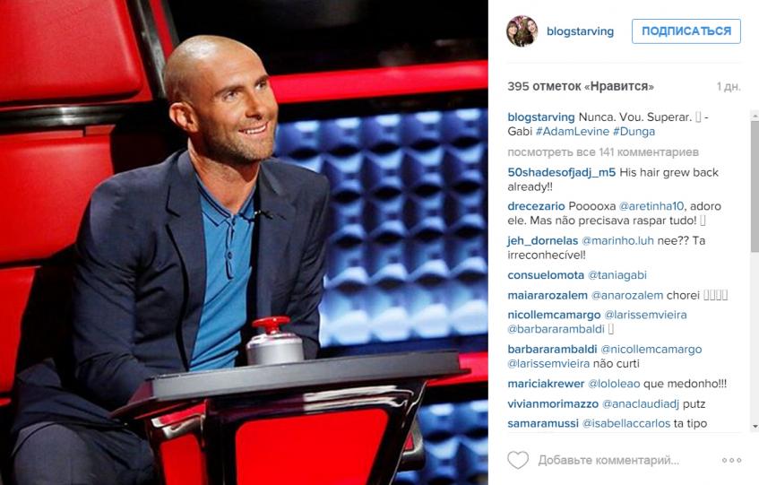 Впервые в новом образе Адам дебютировал 12 октября в эфире шоу The Voice, где он участвует в качестве одного из наставников. Необычный вид певца настолько поразил его коллегу Блейка Шелтона (39), что тот написал в своем Twitter: «Слава богу, Ганди был там… #лысыйадам». Ответ не заставил себя долго ждать: «Простите, но Лекс Лютор был лысым. Я обрил голову. Это значит, побрился добровольно. Огромная разница. ХОРОШО?!! ХОРОШО?!!»