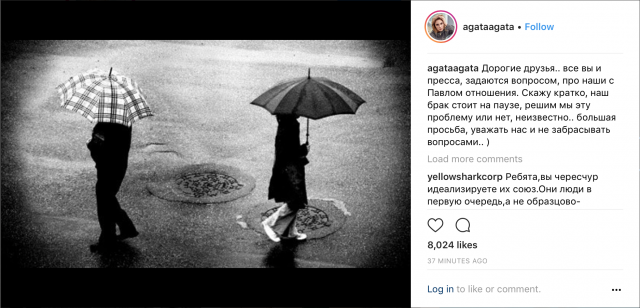 На прошлой неделе Агата Муцениеце (29) шокировала поклонников, когда опубликовала в Instagram новость о том, что ее брак с Павлом Прилучным (30) переживает непростые времена: ««Дорогие друзья. Все вы и пресса задаются вопросом про наши с Павлом отношения. Скажу кратко, наш брак стоит на паузе, решим мы эту проблему или нет, неизвестно. Большая просьба уважать нас и не забрасывать вопросами…» А потом супруги и вовсе отписались друг от друга в Instagram. Поклонники актрисы тут же предположили, что причина разлада в семье – измена Прилучного.