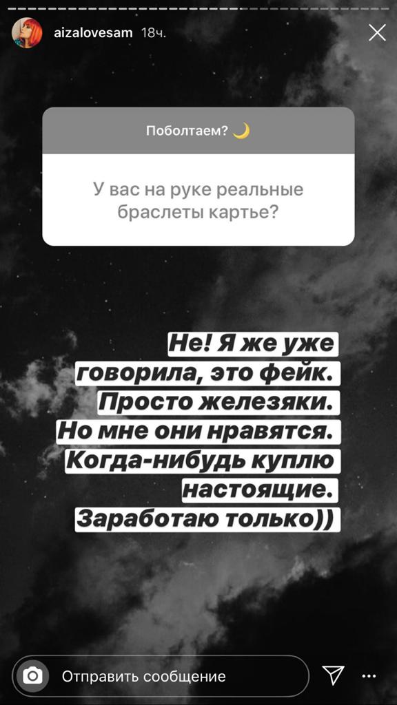 Не обошлось и без вопросов о ювелирных изделиях: звезда призналась, что носит подделку браслетов Cartier: «Я же уже говорила, это фейк. Просто железяки. Но мне они нравятся. Когда-нибудь куплю настоящие. Заработаю только))».