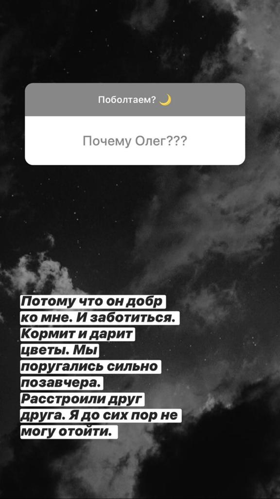 Ну и на вопрос, почему она выбрала именно Олега Майами, Айза ответила: «Потому что он добр ко мне, заботится, кормит и дарит цветы. Мы поругались сильно позавчера. Расстроили друг друга. Я до сих пор не могу отойти».