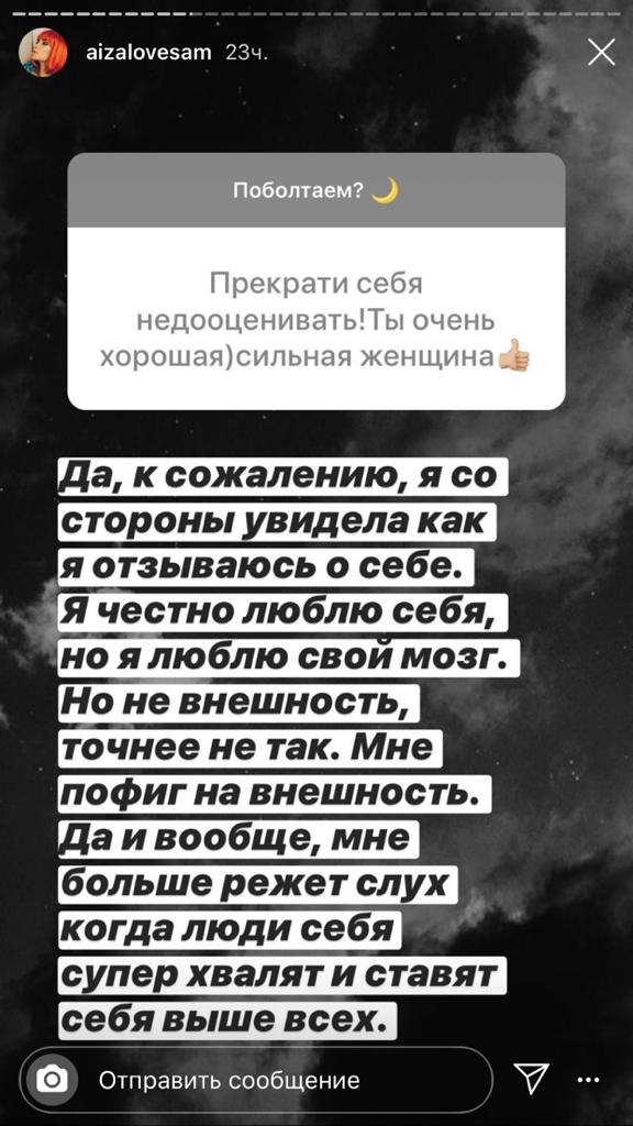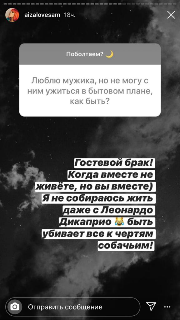 А напоследок Анохина высказалась и о сожительстве: на просьбу подписчицы подсказать ей, как быть, когда любишь мужчину, но не можешь с ним ужиться в бытовом плане», Айза Анохина предложила «гостевой брак» и сама призналась, что отныне не собирается жить с мужчинами.