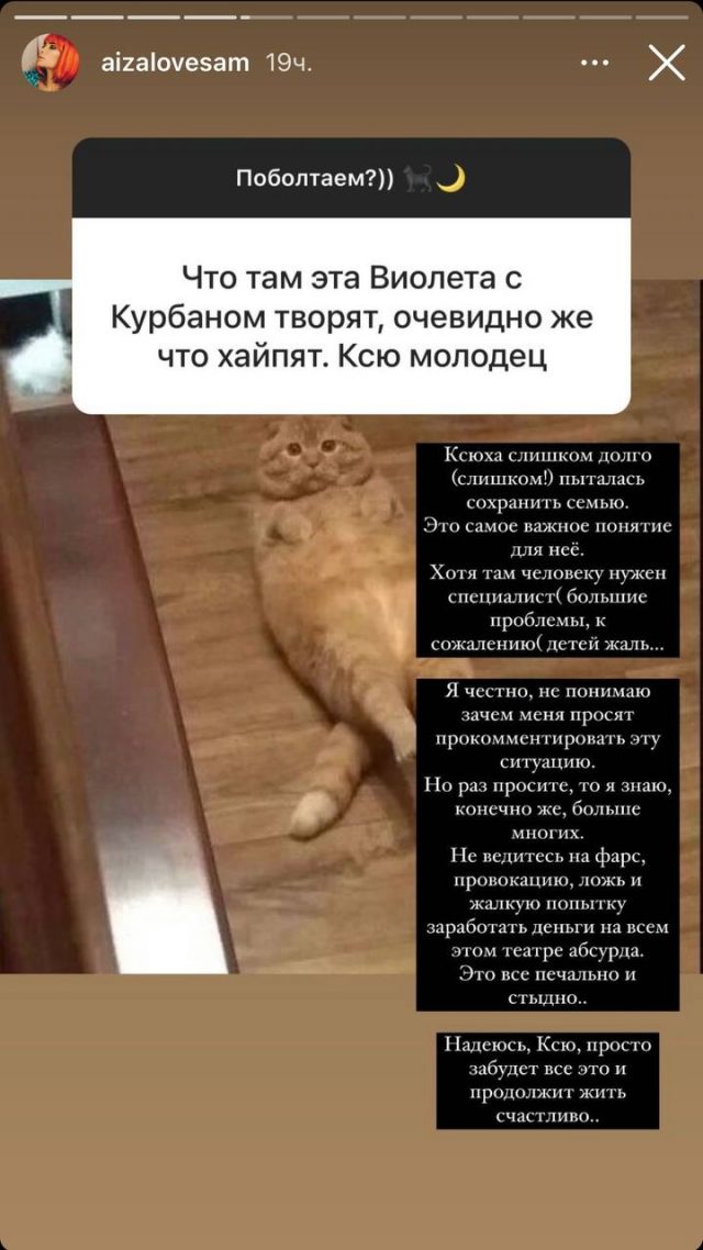 «Ксюха слишком долго (слишком!) пыталась сохранить семью. Это самое важное понятие для нее. Хотя там человеку нужен специалист. Большие проблемы, к сожалению. Детей жаль…» (здесь и далее пунктуация и орфография сохранены – Прим. ред.), — начала Айза. «Я честно, не понимаю зачем меня просят прокомментировать эту ситуацию. Но раз просите, то я знаю, конечно же, больше многих. Не ведитесь на фарс, провокацию, ложь и жалкую попытку заработать деньги на всем этом театре абсурда. Это все печально и стыдно…Надеюсь, Ксю забудет все это и будет жить счастливо», — сказала Долматова в Stories.