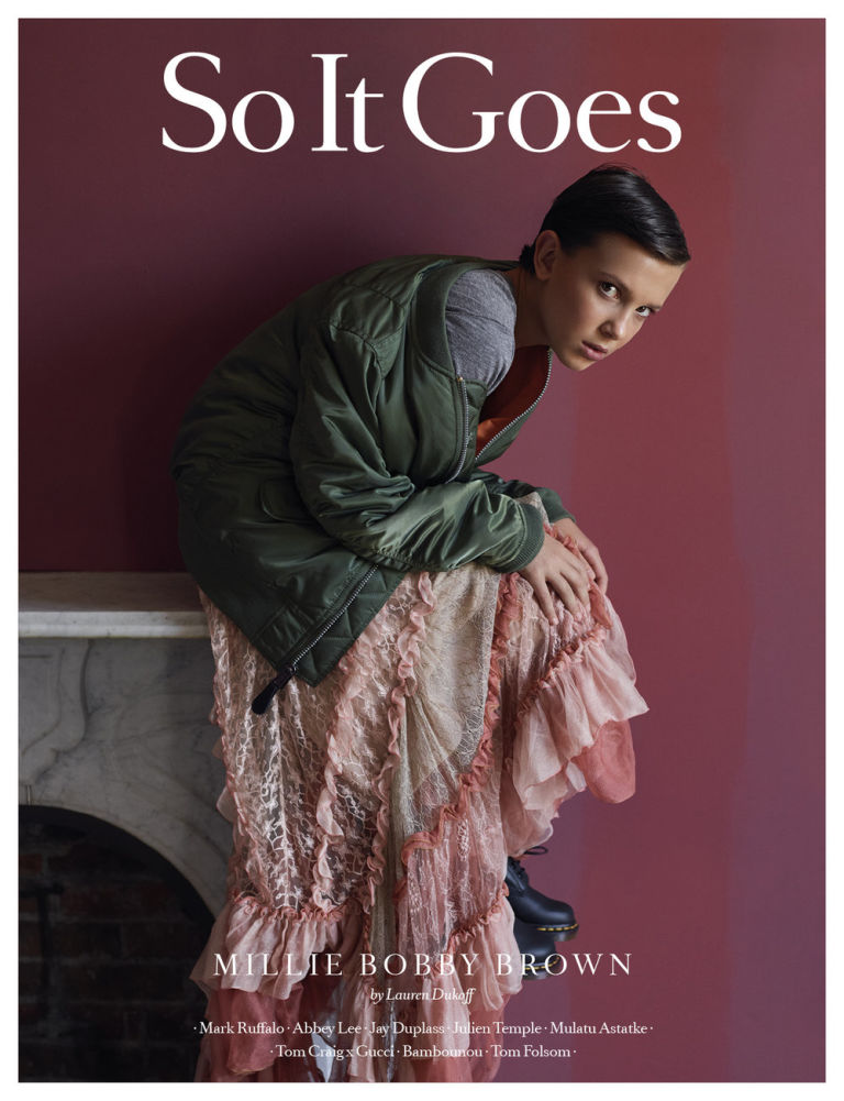 В июле телеканал Netflix запустил сериал «Очень странные дела», в котором подростки отправились на поиски пропавшего друга и столкнулись с потусторонними силами. Меньше чем за месяц восемь эпизодов собрали 8,2 миллиона просмотров. А актеры − Милли Бобби Браун (12), Гейтен Матараццо (14) и Калеб Маклафлин (14) − стали любимцами не только зрителей. От детей все были в восторге после их выхода на красную дорожку премии «Эмми», а Николя Гескьер (45), креативный директор Louis Vuitton, 23 сентября анонсировал с ребятами новый проект, который пока в процессе. Но Милли Бобби Браун не сидит на месте – 12-летняя девочка снялась для обложки журнала So It Goes в кружевном платье Chloe и ботинках Dr. Martines. До Милли на обложке появились «ангелы» Victoria’s Secret Эльза Хоск (27), Марта Хант (27) и жена лидера Maroon 5, Адама Левина (37), Бехати Принслу (27), а еще звезда сериала «Вселенная Стивена Хоккинга» − Фелисити Джонс (32).