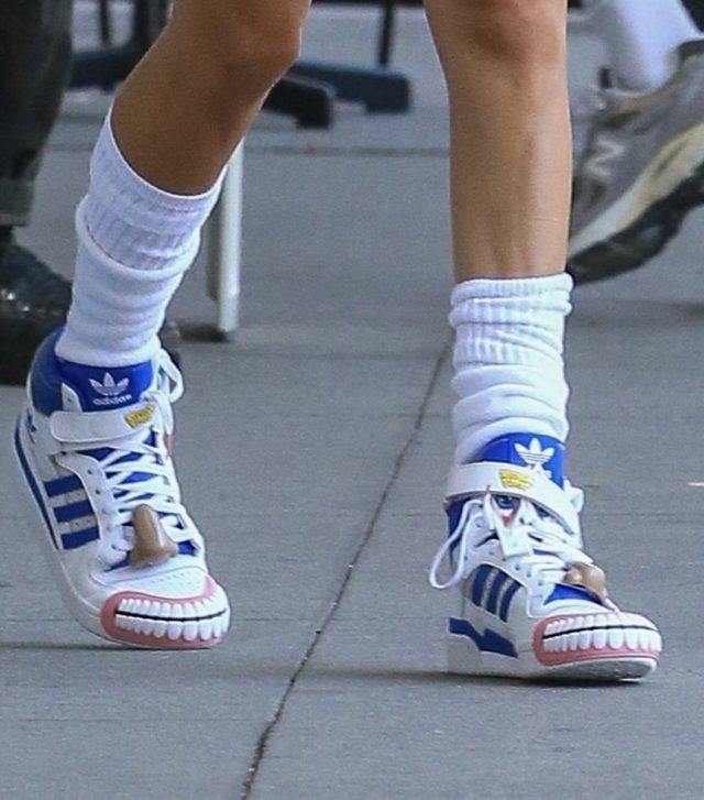 Когда хочется чем-то разбавить простой повседневный образ, на помощь приходят игривые аксессуары и необычная обувь. Пожалуй, этот трюк знают и любят многие модницы, в том числе и Белла Хадид. На субботнюю прогулку супермодель отправилась в удобной одежде в стиле athleisure и смешных кроссовках из коллаборации Kerwin Frost x Adidas Forum High. Пара обуви с тремя полосками мгновенно привлекла наше внимание.
