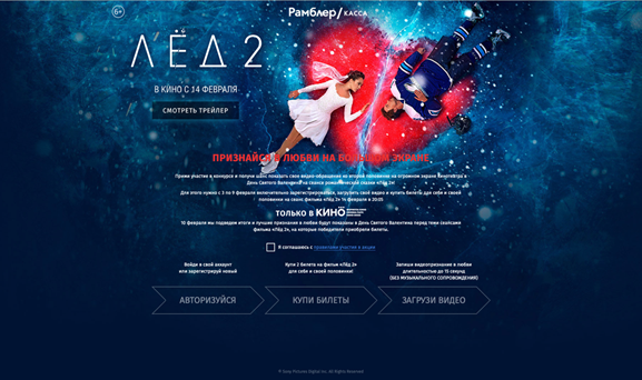 Как поучаствовать в конкурсе? До 9 февраля включительно зарегистрируйся на специальном сайте, приобрети билеты на сеанс «Лед 2» в 20:05 в кинотеатры, участвующие в акции, и загрузи видеовалентинку. Лучшие из них будут показаны перед началом фильма!