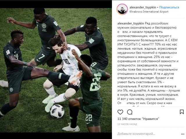 Теперь на защиту прекрасного пола встал и писатель Александр Цыпкин (42). «Ряд российских мужчин окончательно и бесповоротно ох**ли, и начали предъявлять соотечественницам, что те тусуют с иностранными болельщиками. А С КЕМ ИМ ТУСИТЬ?! С нами??? 70% из нас ленивые, наглые, жадные, агрессивные неудачники без понятий о правильном отношении к женщине. 25% из нас — охреневшие от собственной важности и успешности, зажравшиеся, скучные снобы тоже без понятий о нормальном отношении к женщине. И те, и другие отвратительно выглядят, бухают и не умеют быть счастливыми. 5% — нормальные. Я, кстати, в них не вхожу в эти 5%, не думайте. А женщины — лучшие в мире. Красивые, умные, милосердные. И вот у них месяц нормальной жизни. От****сь от них. Скоро они к нам вернутся. От безысходности. Можем пока футбол посмотреть». (Орфография и пунктуация автора сохранены. – Прим. ред.)