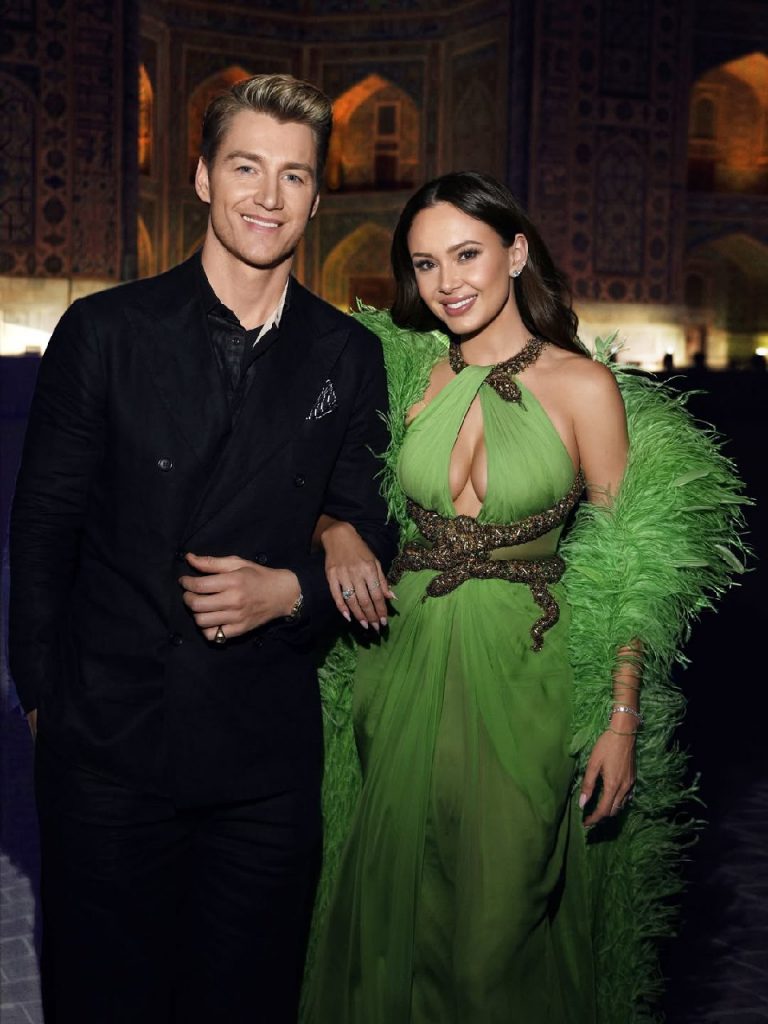 Для церемонии Алексей выбрал классический черный костюм, дополнив образ белой рубашкой. Аида сделала ставку на элегантность – на ней строгая белая блуза, акцентная черная юбка и сумочка с золотой вышивкой смотрелись особенно эффектно на фоне красной дорожки.