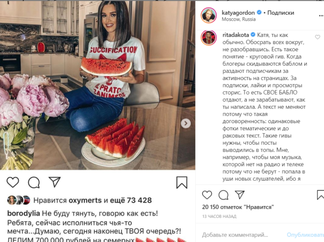 Звезды молчать не стали: Рита Дакота написала в комментариях к «разоблачающему» посту: «Катя, ты как обычно. Обосрать всех вокруг, не разобравшись. Есть такое понятие — круговой гив. Когда блогеры скидываются баблом и раздают подписчикам за активность на страницах. За подписки, лайки и просмотры сторис. То есть СВОЕ БАБЛО отдают, а не зарабатывают, как ты написала. А текст не меняют, потому что такая договоренность: одинаковые фотки тематические и текст. Такие гивы нужны, чтобы посты выводились в топы. Мне, например, чтобы моя музыка, которой нет на радио и телеке, потому что не берут — попала в уши новых слушателей, ибо я двигаюсь в сети сама без продюсеров и помощи. Другим — чтобы свои магазины/товары в кризис двигать. У всех свой запрос. Я понимаю, что тебя тревожит вакцинация и поправки, но в круговом гиве нет ни того, ни другого, ровно как и «продажничества», ибо никому тут не платили, кроме подписчиков. В следующий раз, когда захочешь побрызгать ядом в людей — погугли «вот из круговой гив» (пунктуация и орфография автора сохранены – прим.ред)», — написала певица. Остальные участники розыгрыша пока никак не прокомментировали слова Кати Гордон.