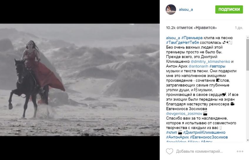 О премьере новой видеоработы Алсу рассказала в Instagram, опубликовав небольшой отрывок из ролика. Артистка поблагодарила всех, кто принимал участие в проекте: «Без очень важных людей этой премьеры просто не было бы. Прежде всего, это Дмитрий Климашенко и Антон Арих #авторы музыки и текста песни. Они подарили мне это наполненное эмоциями произведение — сочетание слов, затрагивающих самые глубинные уголки души, и музыки, проникающей в самое сердце. И все эти эмоции были переданы на экран благодаря мастерству режиссера Евгеноиоса Зосимова. Спасибо вам за то наслаждение, которое я испытываю от совместного творчества с каждым из вас».