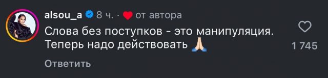 Среди нескольких тысяч комментариев выделяется один, который оставила певица и близкая подруга Натана Алсу. Под видео Reels с анонсом выпуска шоу она написала: «Слова без поступков — это манипуляция. Теперь надо действовать».