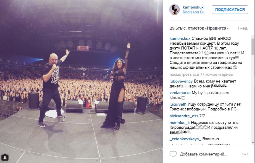 Певица Анастасия Приходько (28) не смогла удержаться и решила прокомментировать заявление Потапа и Насти. На своей странице в Facebook она написала: «Наконец!!! Все частенько используют слова «дно», «днище», вот и я наконец увидела, как выглядит дно!!! Нет! Днище;))) p.s. Даже то, что этому видео два года, не меняет тот факт, что после этого они выступали в России не раз, мне все равно, что вы будете писать, защищать и т.д… Они сделали очень много отвратительных поступков, я их просто не уважаю… Хорошего всем дня!»