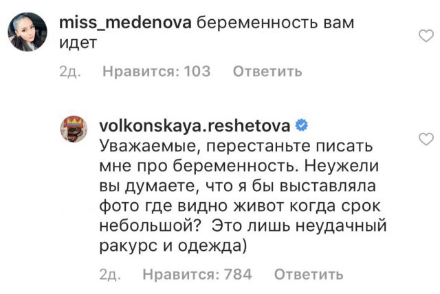 Подхватил и канал YOBAJUR: «Интернет заговорил о беременности Решетовой. Пожалуй понаблюдаем. Ох уж эти узелки на животике …». Потом и в комментариях в Instagram Решетовой понеслось: «А вы беременна?»; «Какой срок?»; «Поздравляем! Пусть растет здоровым». И Настя ответила: «Уважаемые, перестаньте писать мне про беременность. Неужели вы думаете, что я бы выставляла фото где видно живот когда срок небольшой?) Это лишь неудачный ракурс и одежда».