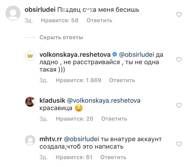 Так, под ее новым фото написали в комментариях: «П*дец с*а меня бесишь». А Решетова ответила: «да ладно, не расстраивайся, ты не одна такая». И после этого в комментариях началась настоящая война: подписчики Насти заступились за нее! «Как так можно писать? Где вас воспитывали? Себя позорите», — пишут в комментариях.