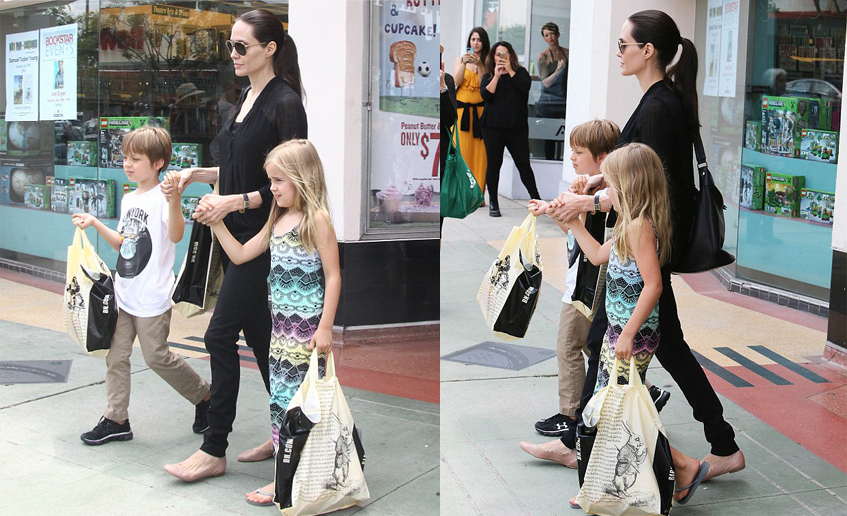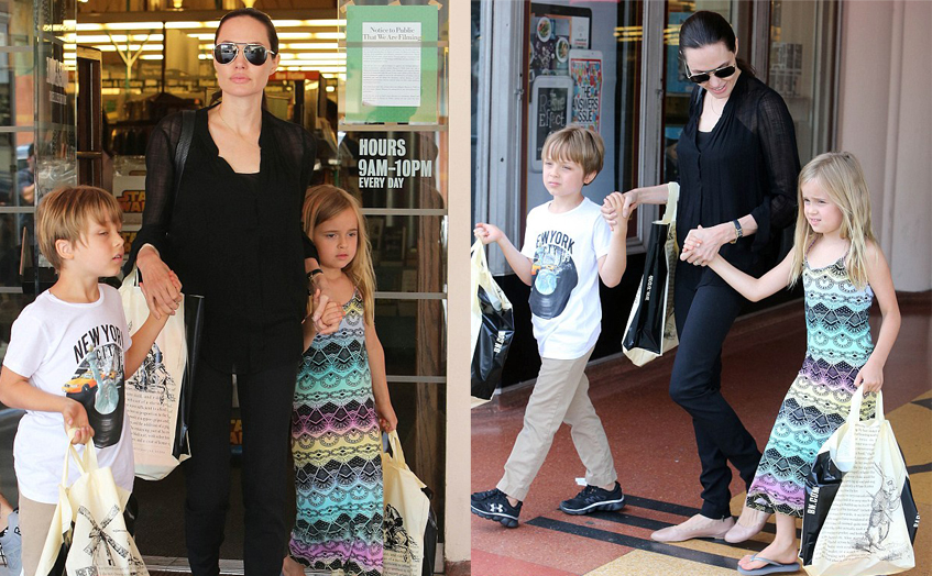 19 июля папарацци застали звезду и ее детей в тот момент, когда они выходили из крупного книжного магазина BookStar в городе Студио-Сити (штат Калифорния). Анджелина, одетая в черные брюки и блузку, шла вместе с Ноксом, который появился в бежевых брюках и футболке с принтом, и Вивьен, блистающую в ярком узорчатом платье.