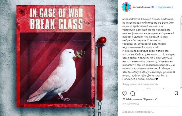 Сама Анна заявила, что никого не винит в случившемся и готова бороться за дочь до конца. В своем Instagram певица написала новый пост, посвященный дочери: «Сложно писать о Монике, не имея права публиковать ее фото. Это одно из требований ко мне: или увидеться с дочкой, но не показывать вам ее фото или не увидеться. Странный выбор. Я думаю, что каждый из нас выбрал бы первое. Есть много требований и условий. Есть много недопониманий и глупостей. И я винила в начале себя, потом его, потом ее. Сейчас уже никого… Но я верю, что любовь победит. Не к друг другу, а нас к маленькому цветочку. И цветочек вырастет и станет красивым, здоровым и очень счастливым цветком. Я обещаю, что приложу к этому максимум усилий. Я очень люблю тебя, Доченька. Мы с Папой тебя очень любим».
